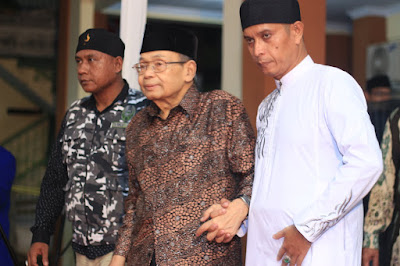 | Mbah KH Nahduddin Royandi Abbas bersama KH Muhammad Abbas Fuad Hasyim saat memasuki lokasi acara puncak Haul Almarhumin Sesepuh dan Warga Pondok Buntet Pesantren, Sabtu (15/4/2017) |